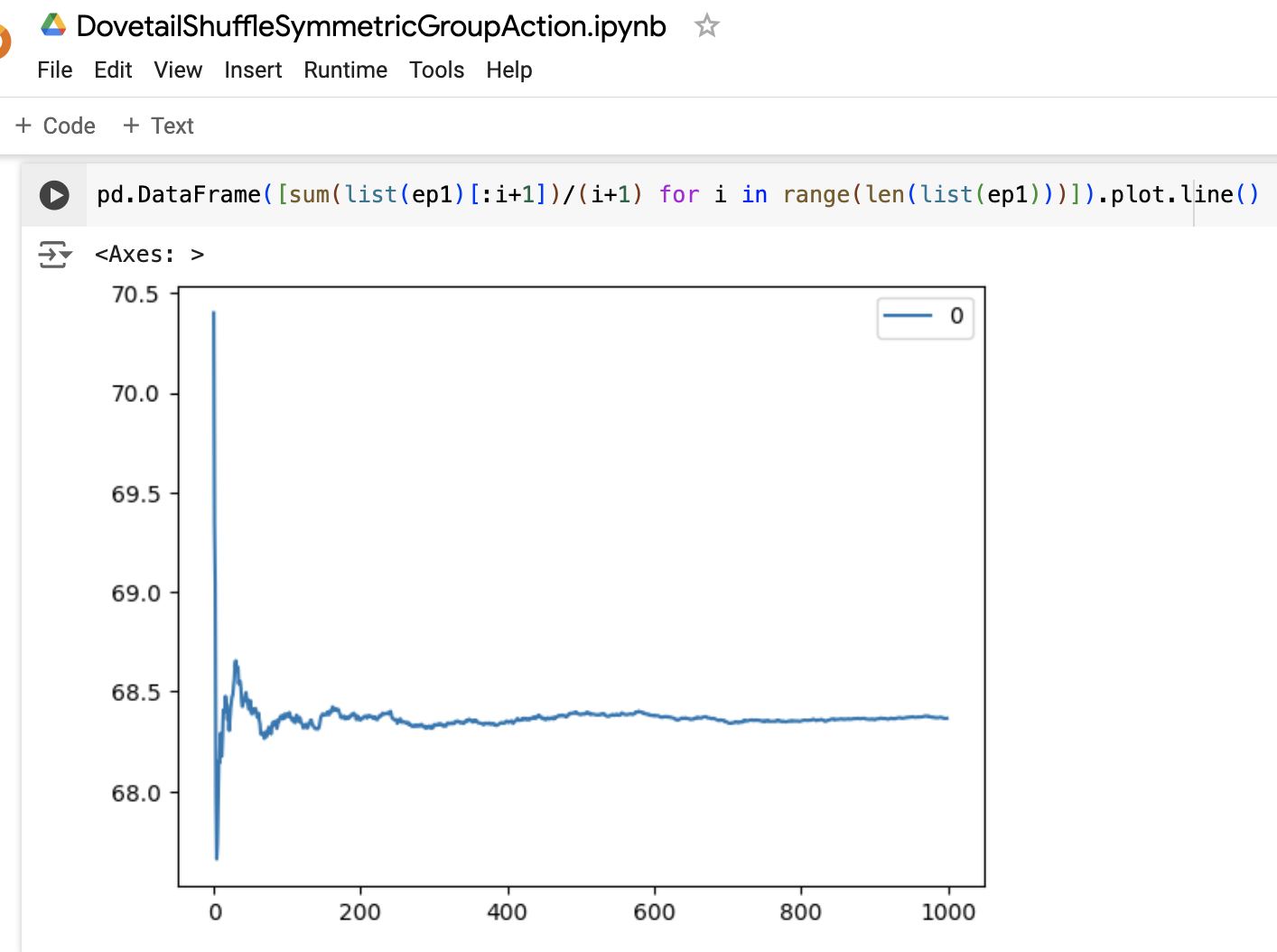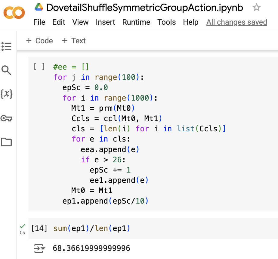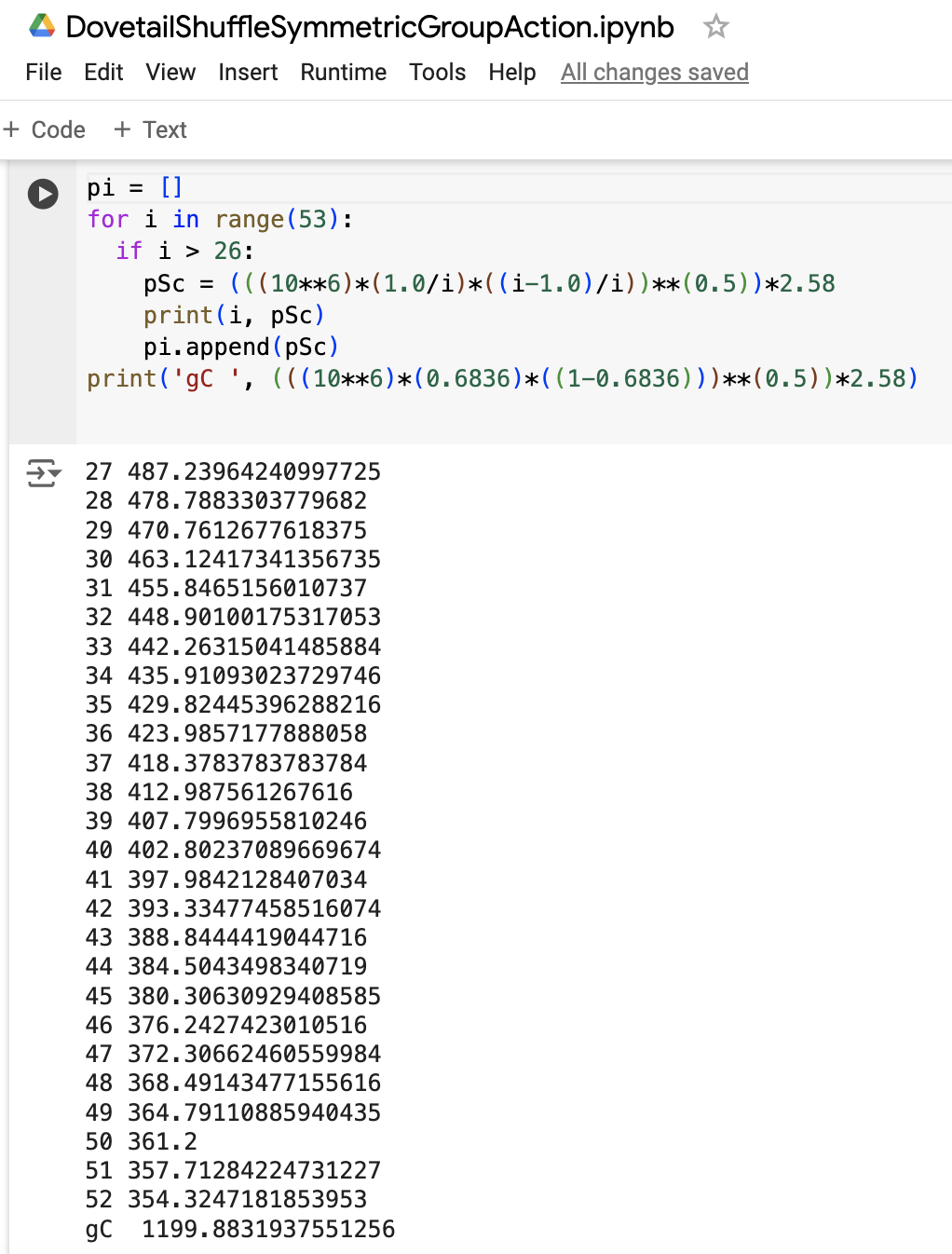 The dovetail shuffle sampling and hypothesis testing for this week’s post was implemented with a Google CoLab Python Notebook, and I will include selections of code and resulting calculations from this notebook in order to present experimental results and hypothesis testing considerations.
