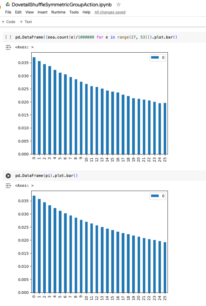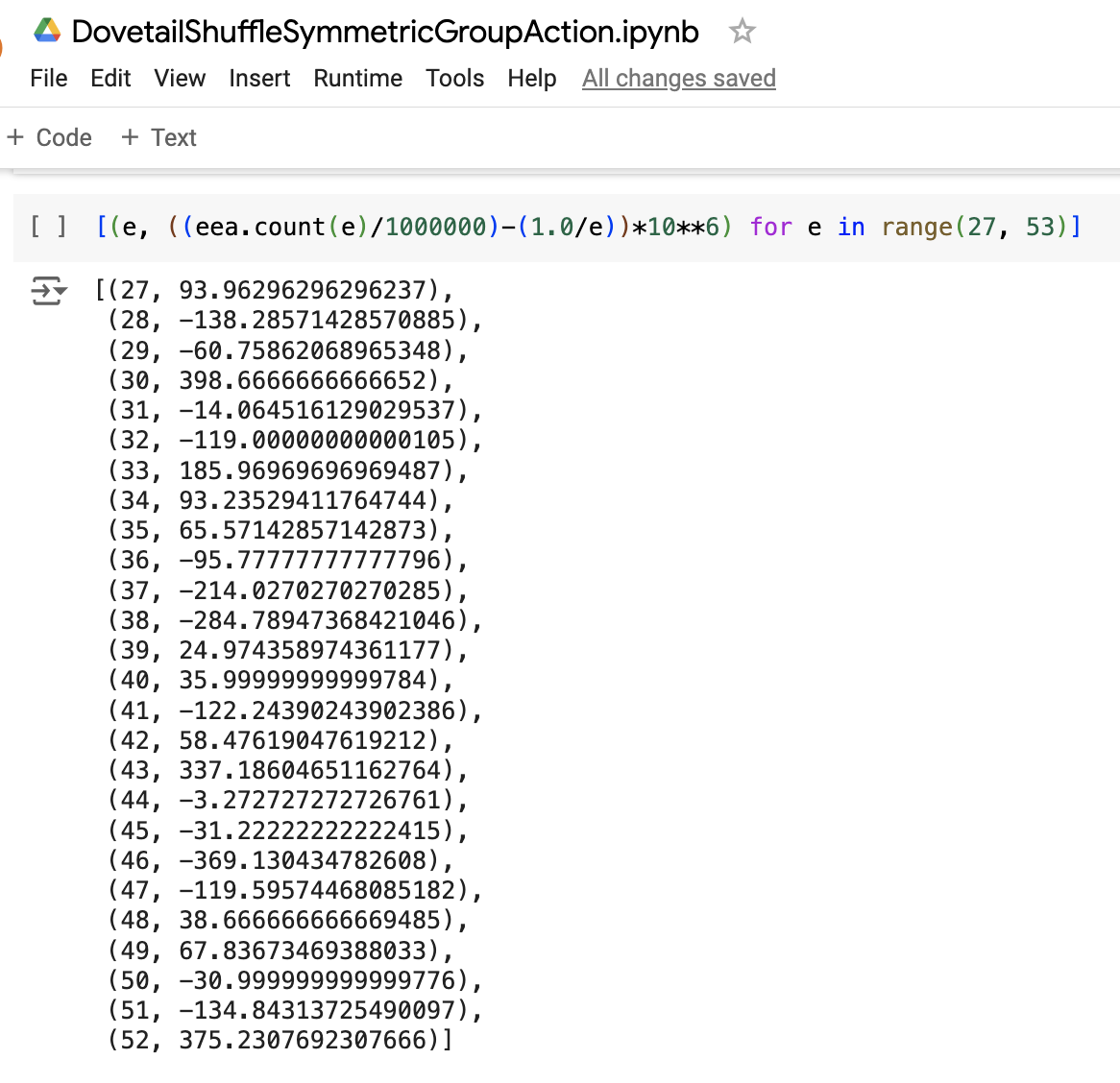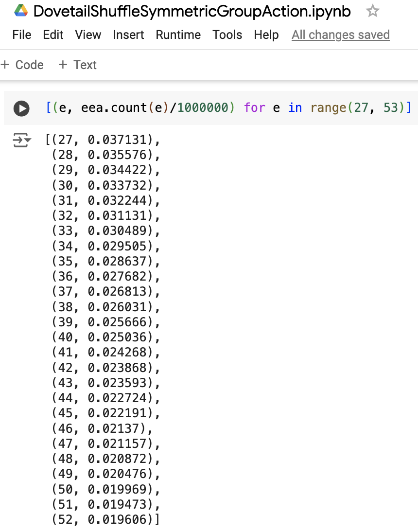 The code on the left above is the exact computation of the true probabilities of interest as 1/k for 26 < k < 53 and the code on the right above is the computation of sample empirical giant cycle probabilities resulting from the events in our 1M dovetail shuffle experiments. From the selections of code above, we can see that in our dovetail shuffle, the empirical probability of giant cycle occurrences do tend to match the true probability of giant cycle occurrences expected of a uniform random sample of symmetric group action permutations.