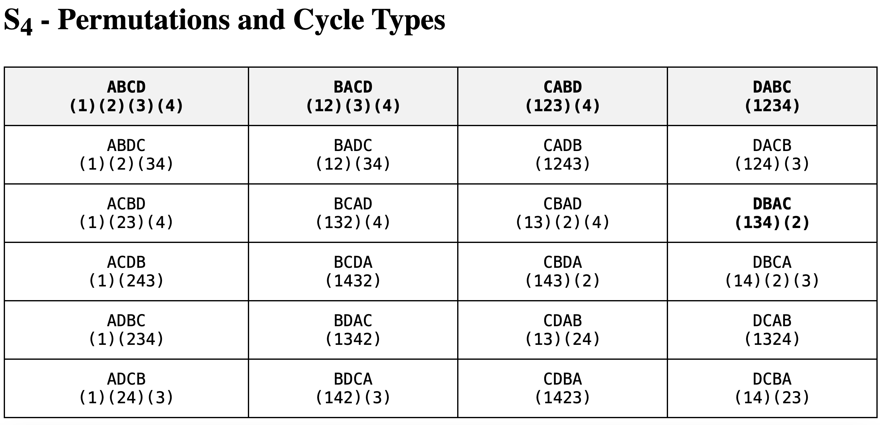 *Cycle types of S3 and S4 listed above to demonstrate symmetric group elements and cycle type decomposition corresponding to permutation group elements of symmetric group action. In the notation above, the permutation group action is considered by generating the permutation that maps to any given symmetric group element from the first symmetric group element listed (either ABC, or ABCD for S3 and S4, respectively). In this way, the cycle types (1)(2)(3) and (1)(2)(3)(4) correspond to the permutation group identity element. As another concrete example, for the ACB S3 symmetric group element, the (1)(23) cycle type decomposition corresponds to keeping A in its place as the first element (1) in ABC, and swapping B and C in their places as the second and third elements (23) in ABC.