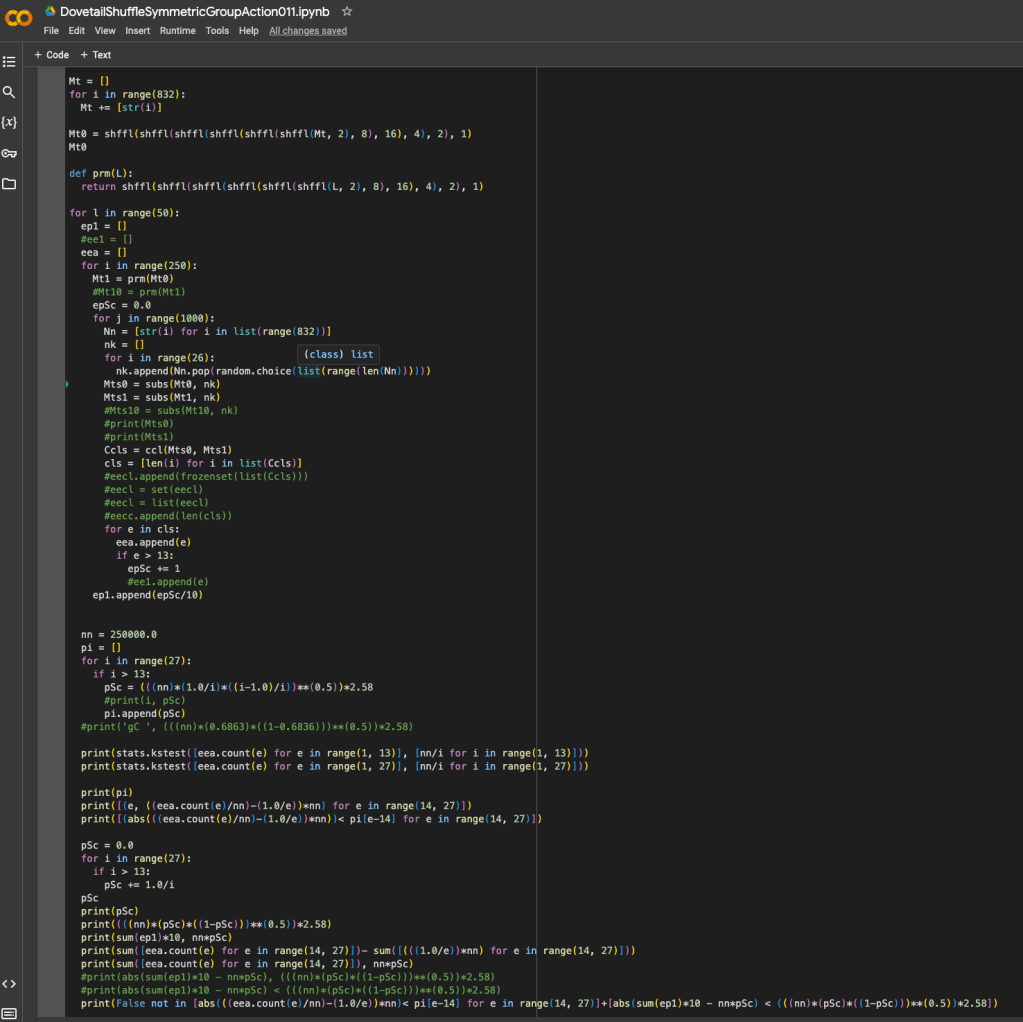 From the code selection below, we can note that for the 832 card large deck size, we defined our permutation procedure to shuffle the deck 12 times, dividing the deck into 2, 8, 16, 4, 2 or 1 block each time and riffling these blocks back together. Importantly, as (832 choose 26) ~ 10**49, the code only shuffles the 832 card deck 250 times, and from this one shuffle it is relatively straightforward to subsample 1000 different combinations of 26 cards to produce unique shuffles of the 26 card deck for a total of 250K 26 card shuffled decks. Thus, we are able to create a fair dovetail shuffling procedure by shuffling a relatively large 832 card deck with a large number of elements in its prime factorization which are the potential number of blocks in any given step in the implementation of the permutation procedure, and we can make this shuffling procedure even more fair by taking a subsample of 26 cards. At the very least it does seem that we have achieved the efficient entropy translation we hoped for with the large deck subsample, however more investigation may be needed to explain exactly why and how.